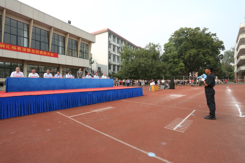 在雄壯的國(guó)歌聲中,軍訓(xùn)成果匯報(bào)表演暨總結(jié)表彰大會(huì)正式開(kāi)始。在朝陽(yáng)中,軍訓(xùn)團(tuán)團(tuán)旗格外鮮艷,襄陽(yáng)四中校長(zhǎng)李靜在襄陽(yáng)四中學(xué)工處主任劉志明和襄陽(yáng)市特警支隊(duì)一大隊(duì)大隊(duì)長(zhǎng)鄭從武的陪同下檢閱了各軍訓(xùn)方隊(duì);伴隨著激情高亢的音樂(lè),各連隊(duì)在教官的口令聲中進(jìn)行了分列式、擒敵拳、大合唱《襄陽(yáng)四中校歌》和《團(tuán)結(jié)就是力量》等軍訓(xùn)匯報(bào)表演,同學(xué)們整齊的隊(duì)伍、飽滿(mǎn)的熱情、精準(zhǔn)的動(dòng)作贏(yíng)得了陣陣掌聲,充分展示出此次軍訓(xùn)的豐碩成果。