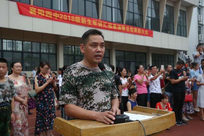 在全場(chǎng)合唱的國(guó)歌聲后,高一年級(jí)周俊主任用“感謝”、“驕傲”和“自信”三個(gè)詞對(duì)本次軍訓(xùn)進(jìn)行了總結(jié)。隨后,副校長(zhǎng)陳登江宣讀了襄陽(yáng)四中《關(guān)于表彰2018級(jí)新生軍訓(xùn)“優(yōu)秀連隊(duì)”、“優(yōu)秀教官”、“優(yōu)秀學(xué)員”的決定》,出席表彰大會(huì)的領(lǐng)導(dǎo)為受表彰的先進(jìn)集體和先進(jìn)個(gè)人頒發(fā)了證書(shū)并與他們合影留念。最后,表彰大會(huì)在市公安局調(diào)研員李旭勇同志的總結(jié)講話(huà)和校長(zhǎng)李靜對(duì)學(xué)生們的贊揚(yáng)和殷切希望中落下帷幕。