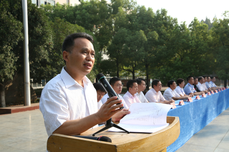 8月25日上午8點(diǎn)整,我校2019級(jí)學(xué)生軍訓(xùn)動(dòng)員大會(huì)在集會(huì)廣場(chǎng)隆重舉行。襄陽市公安局特警支隊(duì)副支隊(duì)長(zhǎng)曾應(yīng)剛同志,襄陽市公安局特警支隊(duì)副處教研員李江亭同志,襄陽四中校長(zhǎng)李靜老師,襄陽四中黨委書記朱啟龍老師,襄陽四中黨委委員、副校長(zhǎng)陳登江老師,襄陽四中黨委委員、副校長(zhǎng)王立合老師,襄陽四中學(xué)生工作處主任劉志明老師以及高一年級(jí)領(lǐng)導(dǎo)班子全體成員在主席臺(tái)就座,市公安局特警支隊(duì)幫訓(xùn)官兵、2019級(jí)新生班主任、參訓(xùn)學(xué)生參加了此次動(dòng)員大會(huì)。大會(huì)由學(xué)工處副主任郭士念主持。