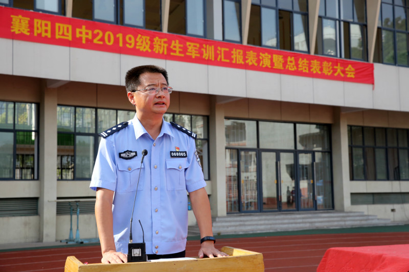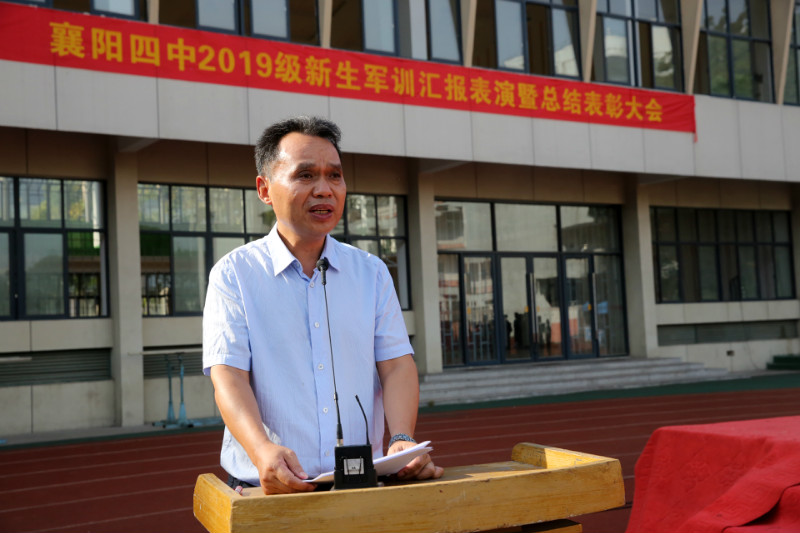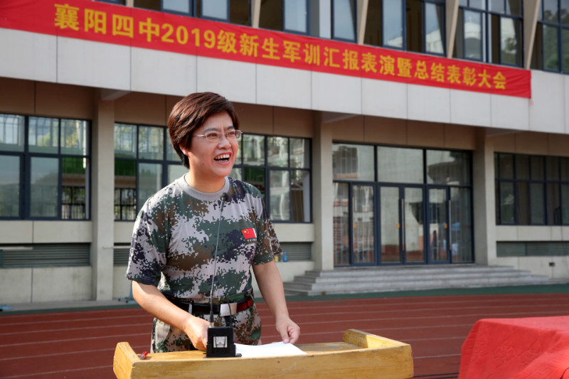 在全場合唱結(jié)束后,郭士念老師繼續(xù)主持本次軍訓(xùn)的總結(jié)表彰大會。高一年級主任朱天斌老師首先對本次軍訓(xùn)進(jìn)行了總結(jié)。隨后,副校長陳登江老師宣布了28日晚的紅歌合唱比賽結(jié)果并宣讀了襄陽四中《關(guān)于表彰2019級新生軍訓(xùn)“優(yōu)秀連隊(duì)”、“優(yōu)秀教官”、“優(yōu)秀學(xué)員”的決定》,出席表彰大會的領(lǐng)導(dǎo)為受表彰的先進(jìn)集體和先進(jìn)個人頒發(fā)了證書并與他們合影留念。在特警支隊(duì)政委朱碧嵐同志的總結(jié)講話之后,校長李靜發(fā)表了總結(jié)講話,對學(xué)生們表達(dá)了贊揚(yáng)和殷切的希望。李校長希望同學(xué)們能夠“在襄陽四中厚植基礎(chǔ),度過三年充實(shí)時光,做優(yōu)秀四中人,遇見最好的自己”并努力成為“點(diǎn)亮夢想、明確努力方向的四中人”“胸懷祖國、筑牢發(fā)展根基的求知者”和“努力前行、創(chuàng)造美好未來的實(shí)力派”。