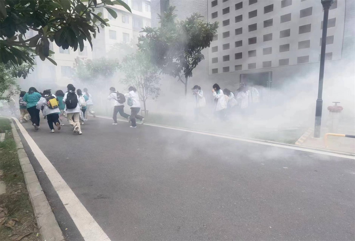 13:58,警報長鳴,煙霧滾滾,應(yīng)急疏散演練正式開始。學(xué)生們在各樓層老師的引導(dǎo)下,彎腰、捂鼻,沿著指定疏散路線迅速下樓,用最短的時間,成功撤離到安全地帶。整個演練過程緊張有序、撤離迅速、有條不紊,無推搡、擁擠、踩踏等現(xiàn)象,達(dá)到了演練的預(yù)期效果。
