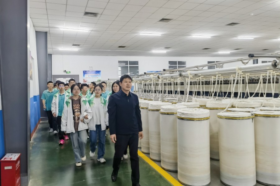 天舒紡織董事長(zhǎng)劉玉濤帶領(lǐng)研學(xué)學(xué)員參觀生產(chǎn)車間