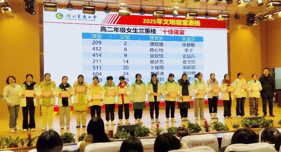 學(xué)工處副主任劉紅枝、高二年級(jí)主任蔣華為“十佳文明寢室”頒獎(jiǎng)
