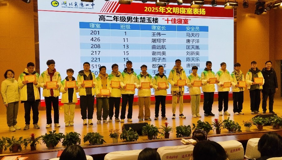 會(huì)議伊始,方笑宇主任宣讀了高二上學(xué)期“十佳文明寢室”、“優(yōu)秀寢室”評(píng)選結(jié)果。經(jīng)綜合衛(wèi)生檢查、紀(jì)律表現(xiàn)、文化氛圍等多項(xiàng)指標(biāo)考核,楚玉樓201男寢、蘭蕙樓209女寢等寢室脫穎而出。劉紅枝、蔣華為獲獎(jiǎng)寢室頒發(fā)榮譽(yù)證書。隨后,學(xué)生代表手捧鮮花走上舞臺(tái),向辛勤付出的寢室生活老師獻(xiàn)禮。每一位生活老師也現(xiàn)場(chǎng)表達(dá)了對(duì)孩子們的愛,或是鼓勵(lì),或是希望,一句句質(zhì)樸而又溫馨的語(yǔ)句,再次讓同學(xué)們感動(dòng)不已。高二(30)班李嘉志同學(xué)感慨道:“感謝阿姨們的日夜守護(hù),讓我們?cè)趯嬍腋惺艿郊业臏嘏?/span>”