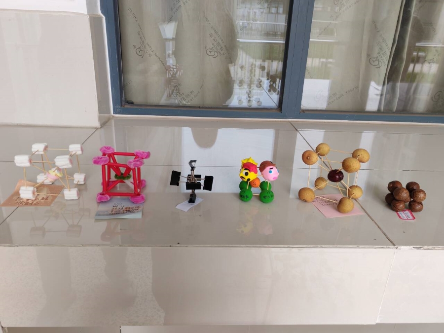 比賽現(xiàn)場(chǎng),200余件創(chuàng)意作品將化學(xué)之美具象化,更有腦洞大開(kāi)的"吃貨科學(xué)"驚艷全場(chǎng)。這里既有傳統(tǒng)材料的匠心之作,也有前沿科技的創(chuàng)新呈現(xiàn)。石墨層間堆疊到金屬晶胞堆積,課本上的球棍模型在同學(xué)們手中煥發(fā)新生。特等獎(jiǎng)作品有配合燈帶打造出銀河旋臂般的視覺(jué)效果;有利用鐵絲制作的標(biāo)準(zhǔn)C60晶胞。令人驚喜的是那些突破常規(guī)的創(chuàng)意組合:利用棉花糖,龍眼,長(zhǎng)尾夾等新奇的材料。化學(xué)備課組長(zhǎng)王麗婧老師贊嘆:“這些看似隨意的材料選擇,實(shí)則暗含同學(xué)們對(duì)晶體配位數(shù)、鍵角等概念的深度理解。這些作品不僅精準(zhǔn)還原了微觀結(jié)構(gòu),更展現(xiàn)了理科生的藝術(shù)創(chuàng)造力。”